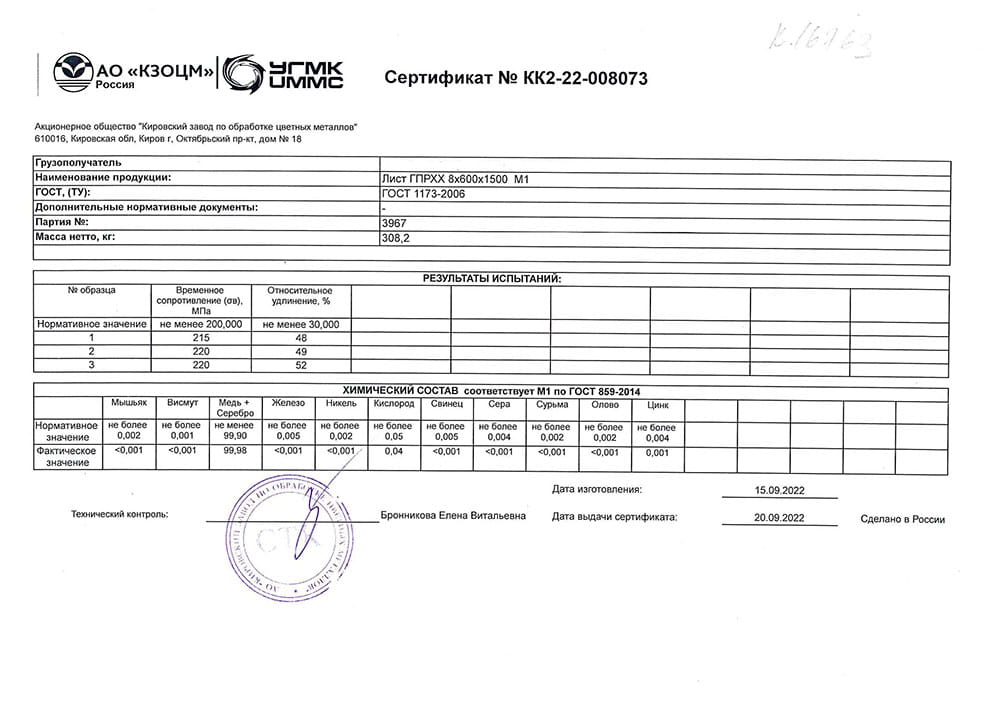 Медные листы по ГОСТ 1173-2006, прямоугольного сечения, различается по чистоте меди, содержанию в сплаве: олова, сурьмы, свинца и никеля. Холоднокатаные и горячекатаные листы с матовой поверхностью, по ГОСТ 495-92, из меди марок М1, М2 и М3 с химическим составом по ГОСТ 859-2001. Отбор и подготовку проб по ГОСТ 24231-80.